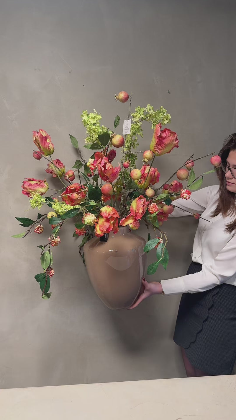 De organische vorm en frisse kleuren geven dit arrangement een lichte, natuurlijke uitstraling. Perfect als stijlvolle blikvanger op een tafel, dressoir of in een entree. Het arrangement brengt direct sfeer en laat zien hoe bloemen een ruimte kunnen verrijken.