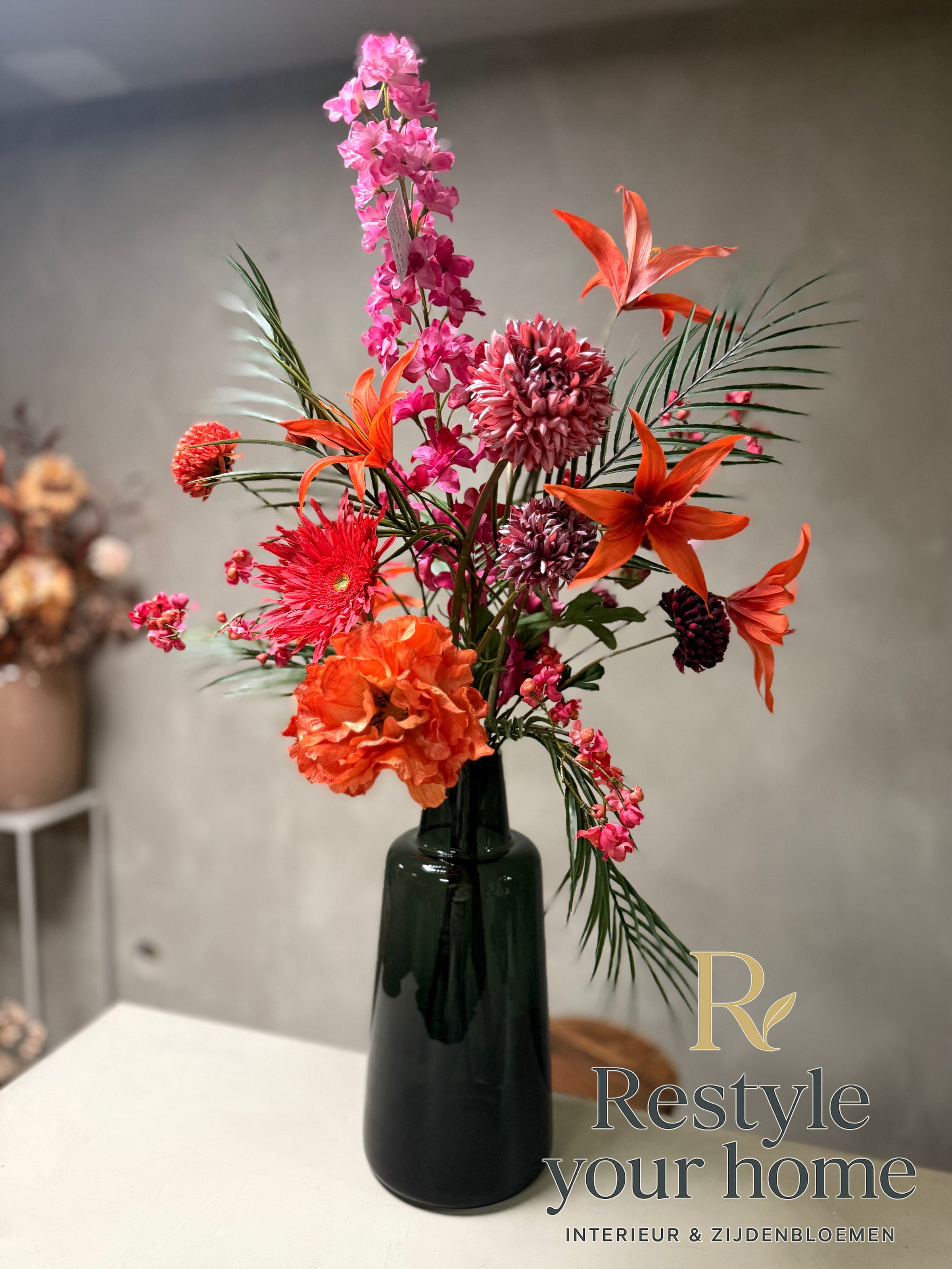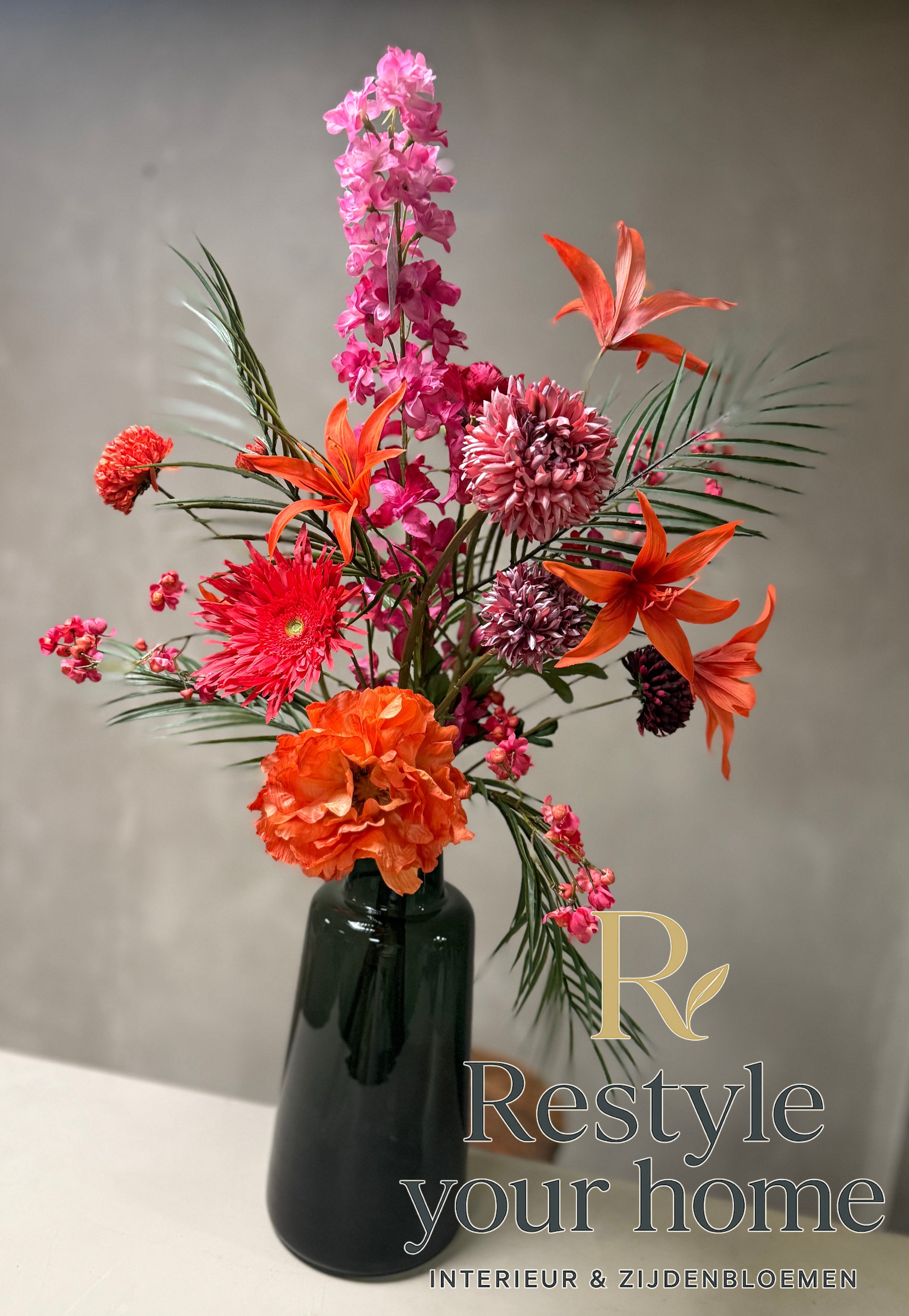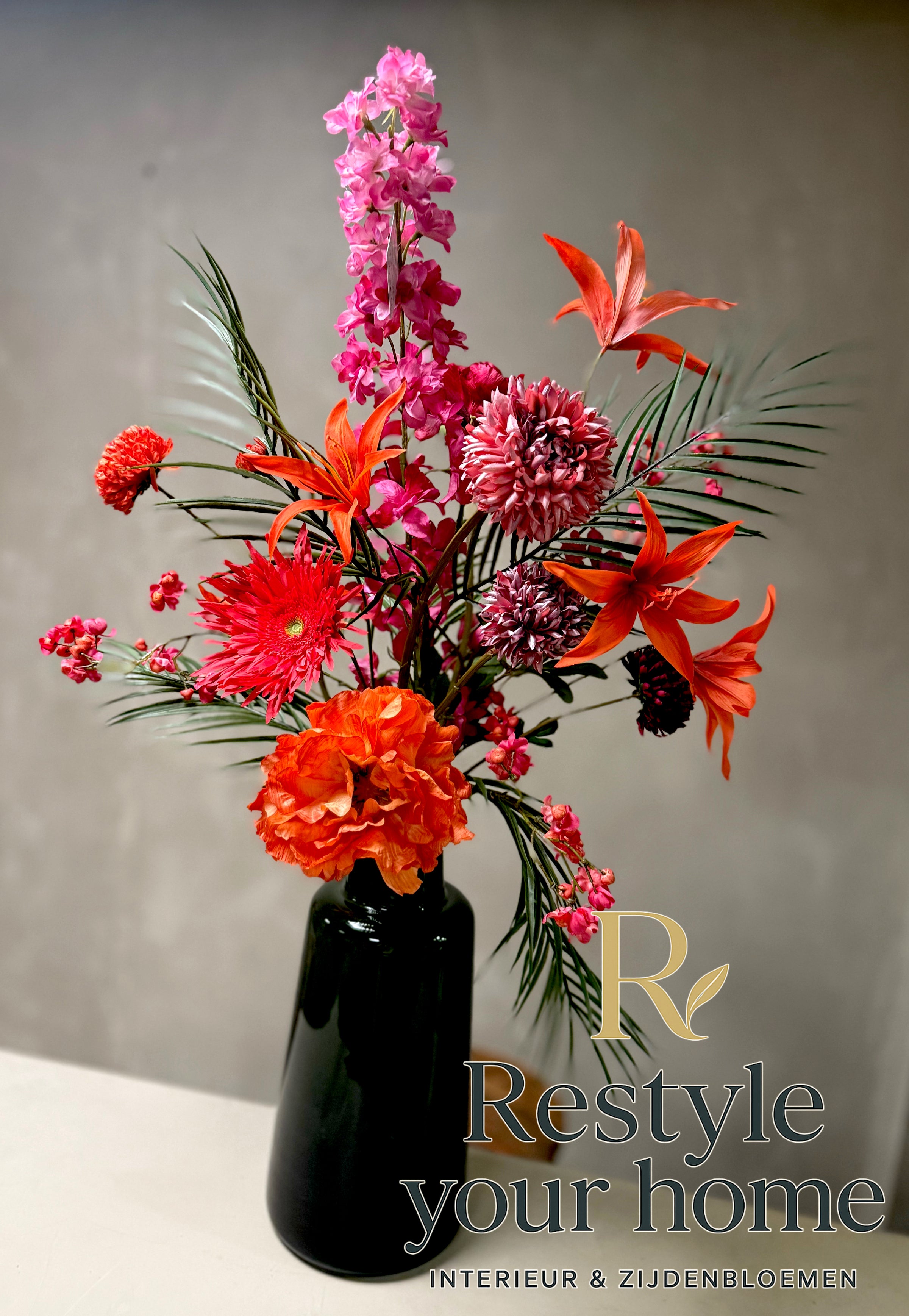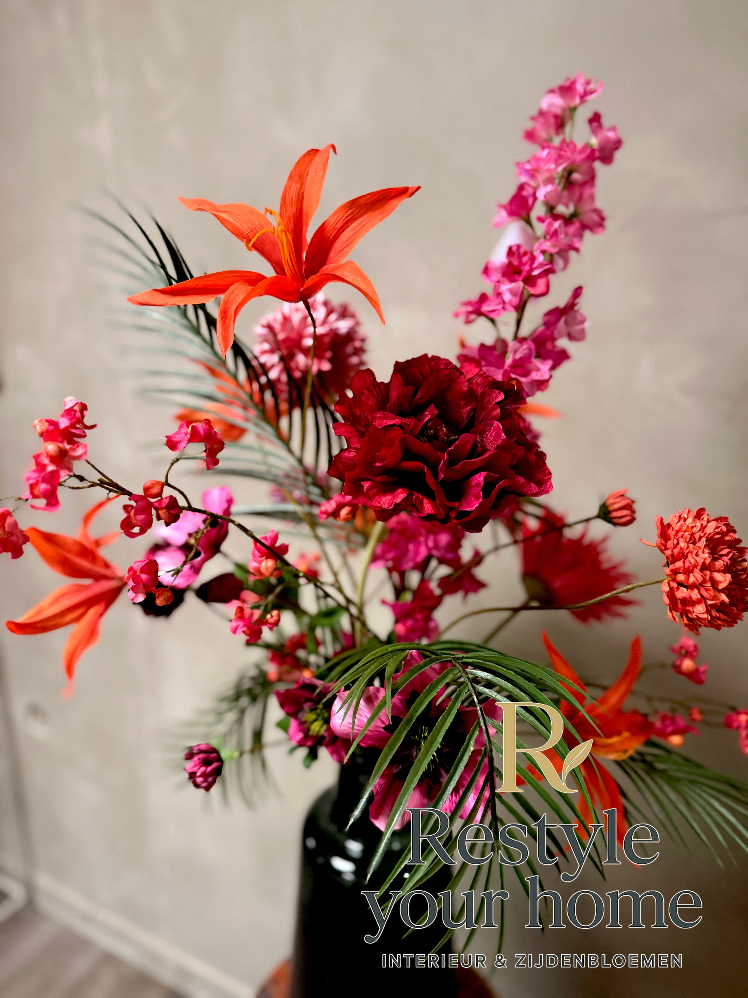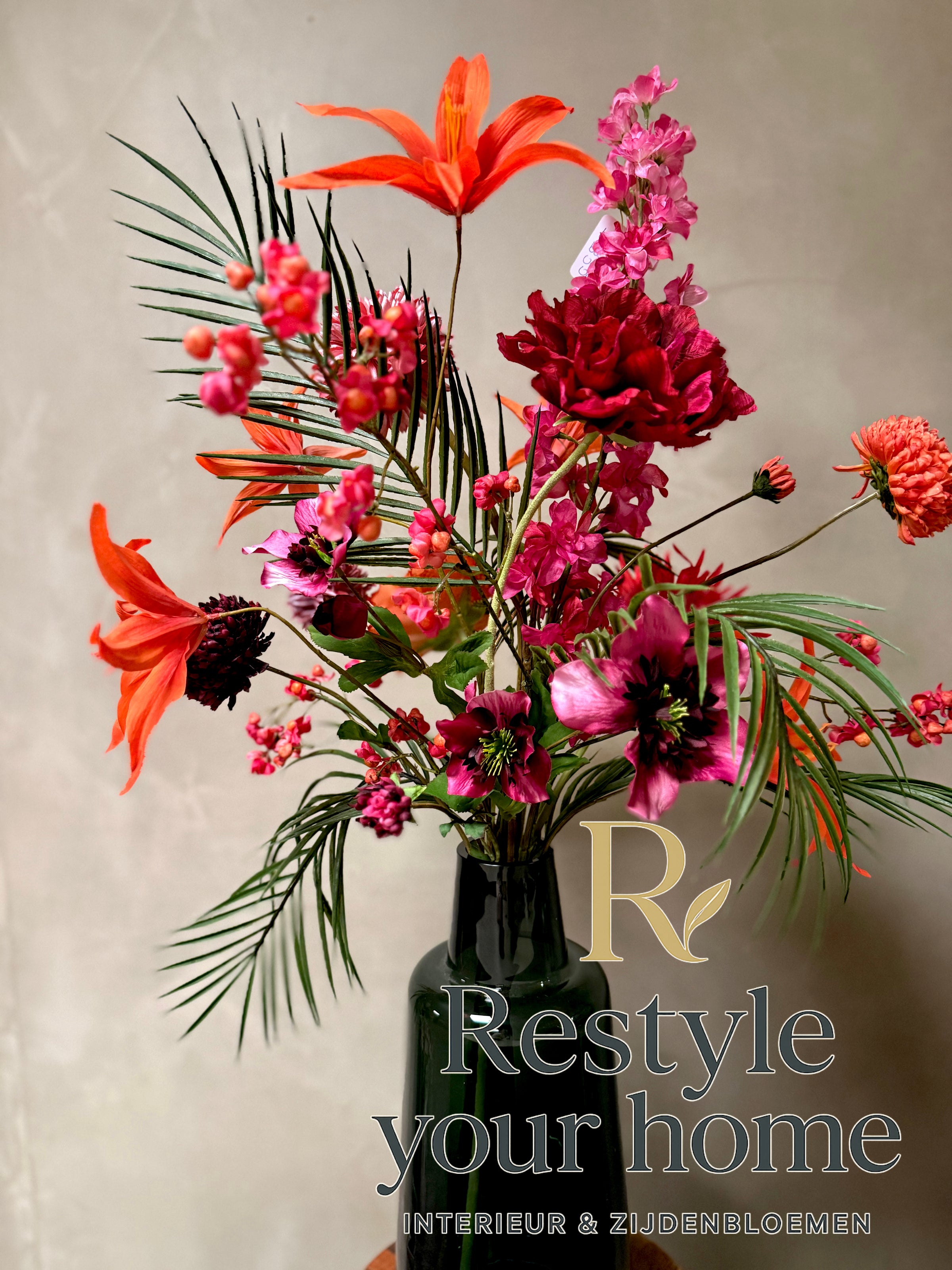 Breng warmte in de koudste dagen met dit sprankelende zijdenboeket. Wintervuur combineert vurige tinten rood, oranje en fuchsia met een vleugje elegant groen. Het resultaat: een krachtig statement dat energie en sfeer toevoegt aan elke ruimte.
